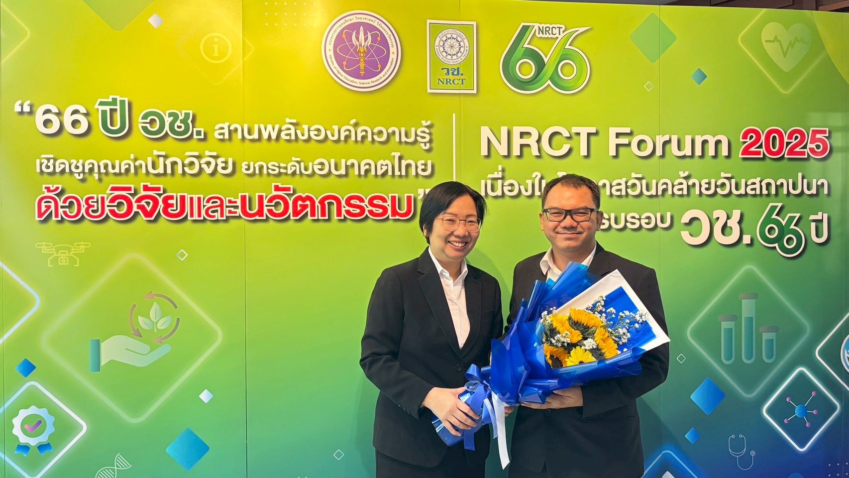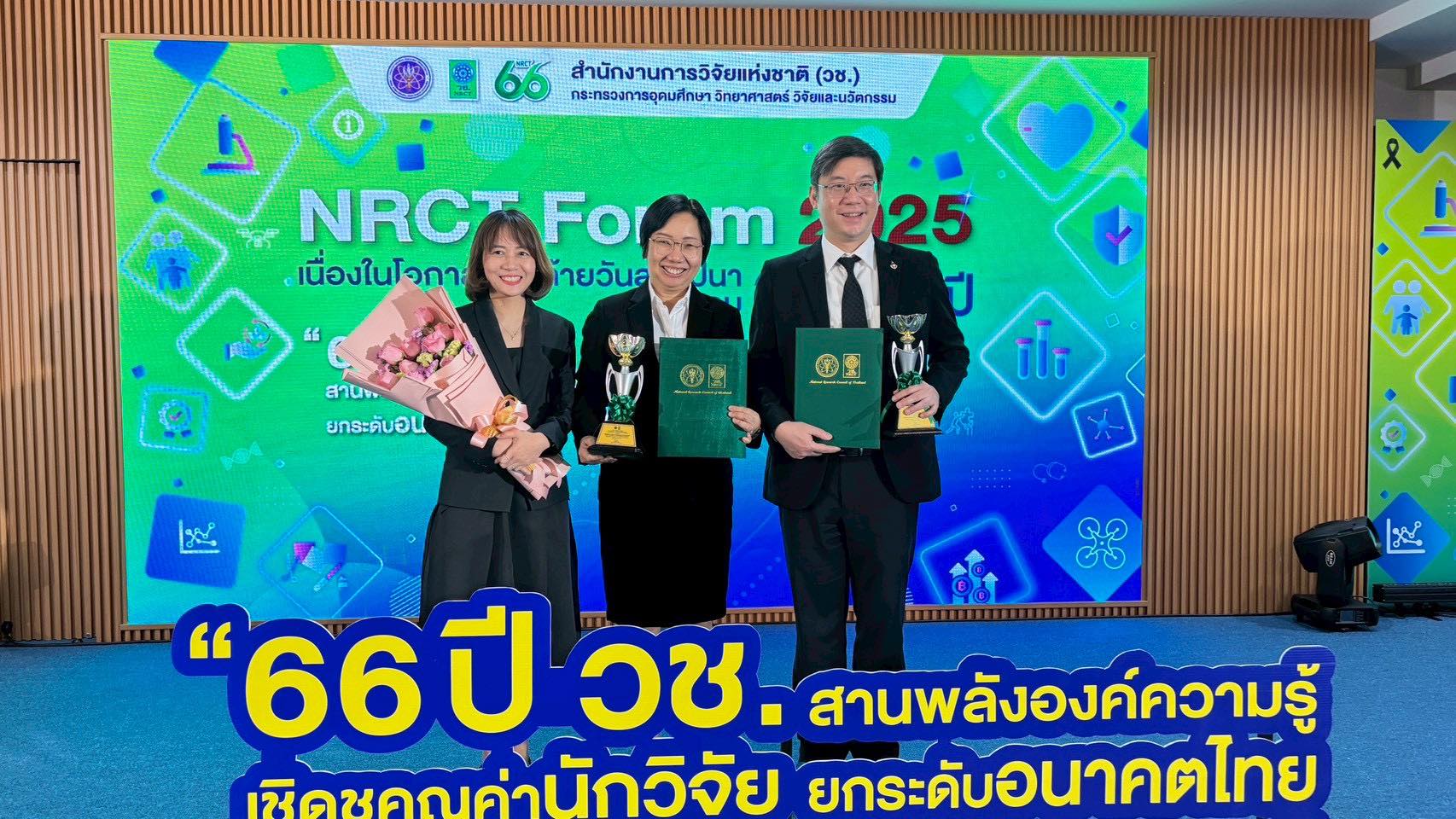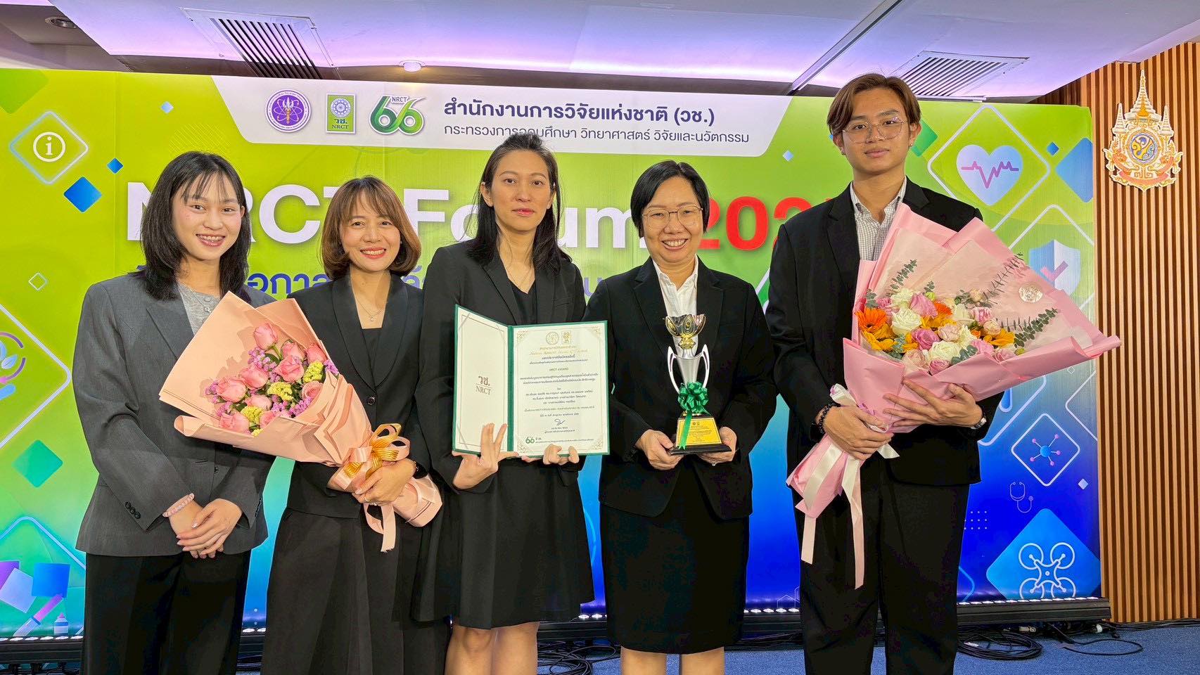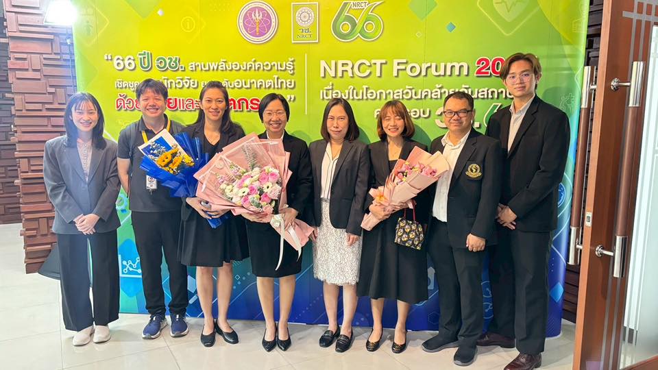 ดร.วรินธร สงคศิริ รองผู้อำนวยการด้านสนับสนุนการวิจัยและพัฒนา และ ผู้อำนวยการกลุ่มวิจัยวิศวกรรมชีวเคมีและชีววิทยาระบบ ไบโอเทค สวทช. ร่วมกับ ดร. กาญจนา แสงจันทร์ นักวิจัยจากไบโอเทค ดร. อรรณพ นพรัตน์ รองอธิการบดี มจธ. และนักวิจัยจากสถาบันพัฒนาและฝึกอบรมโรงงานต้นแบบ (สรบ.) มจธ. ได้แก่ ดร. รื่นรมย์ เลิศลัทธภรณ์ นางสาวนาริสา โชคมงคล และนางสาวมณีรัตน์ ทองเรือง ได้รับรางวัล “NRCT Award” ในงาน NRCT Forum 2025 เนื่องในโอกาสวันคล้ายวันสถาปนา วช. ครบรอบ 66 ปี จากผลงานวิจัยเรื่อง “แพลตฟอร์มบูรณาการเศรษฐกิจหมุนเวียนอุตสาหกรรมแป้งมันสำปะหลัง ด้วยวิศวกรรมการผลิตและเทคโนโลยีไฮโดรไซโคลนประสิทธิภาพสูง”